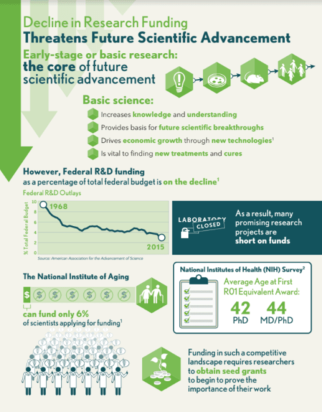The National Institute of Aging can only fund 6% of scientists currently applying for funds. The National Institutes of Health (NIH) has also been severely affected. Funding in such a modest setting requires researchers to obtain seed grants to prove their work’s importance.