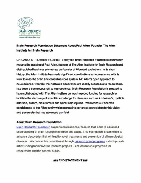 CHICAGO, IL – (October 16, 2018) –Today the Brain Research Foundation community mourns the passing of Paul Allen, founder of The Allen Institute for Brain Research and